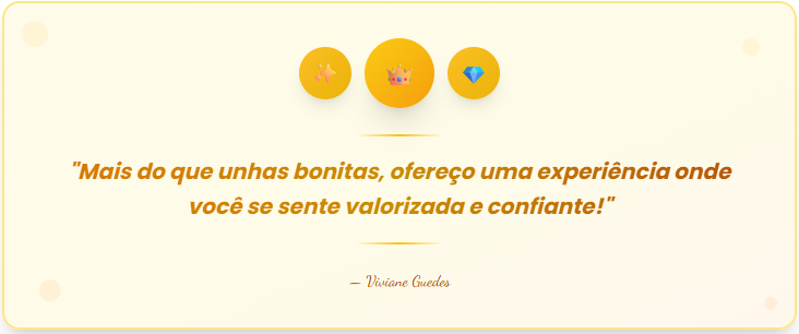 Sou Viviane Guedes, manicure e pedicure profissional dedicada a transformar unhas e proporcionar momentos de cuidado e bem-estar. Com técnicas modernas e produtos de qualidade, ofereço atendimento personalizado para elevar sua confiança.